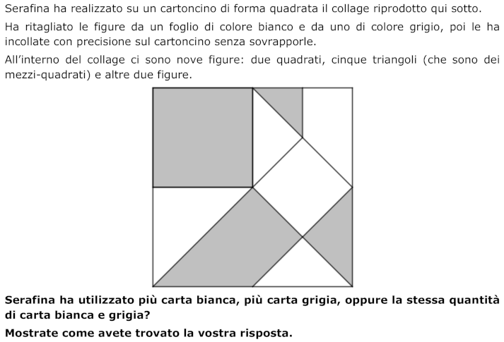 - Rendersi conto che la metà sinistra del collage è grigia, la metà destra non è tutta bianca: compare un triangolino grigio in alto. Dedurre che le figure grigie occupano una superficie maggiore rispetto alle bianche.
