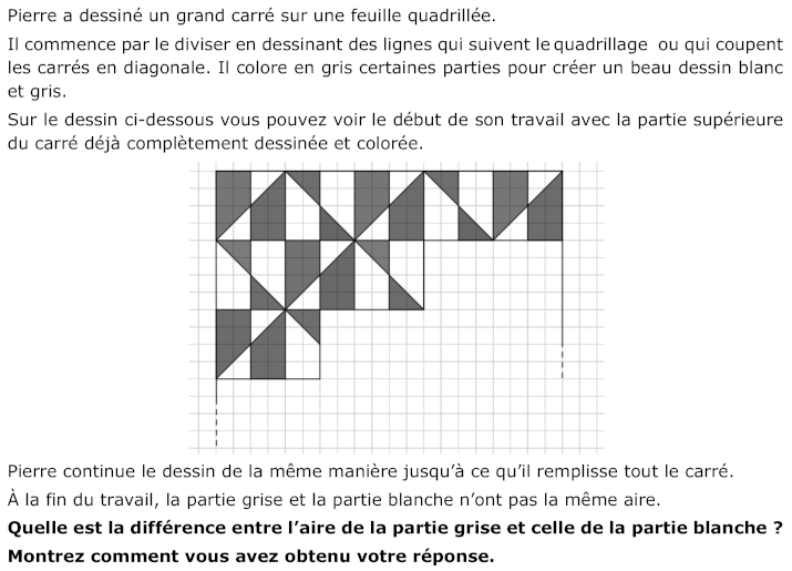 À partir d'un modèle proposé, terminer un pavage composé de figures blanches et grises, tracé dans un quadrillage de 20 x 20 carrés. Comparer les aires des zones blanches et grises du pavage complet et déterminer leur différence.