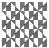 - le dessin est constitué de bandes (de 4 petits carrés de large) dans lesquelles alternent deux trapèzes gris, deux triangles blancs, deux trapèzes blancs et deux triangles gris ;