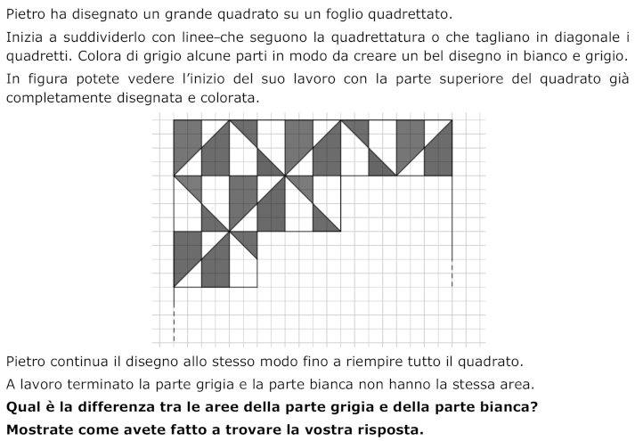 - Capire che per risolvere il problema è possibile contare il numero totale di poligoni di ciascun tipo e calcolare la misura dell’area complessiva per ciascuna delle due zone di colore diverso, scegliendo un’unità di misura opportuna.