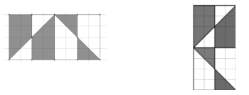 - Per esempio le coppie di motivi adiacenti come si vedono di seguito: sono costituiti da 2 trapezi grigi e due trapezi bianchi uguali tra loro, da due triangoli bianchi e due triangoli grigi uguali tra loro: dunque la superficie bianca ha la stessa area di quella grigia.