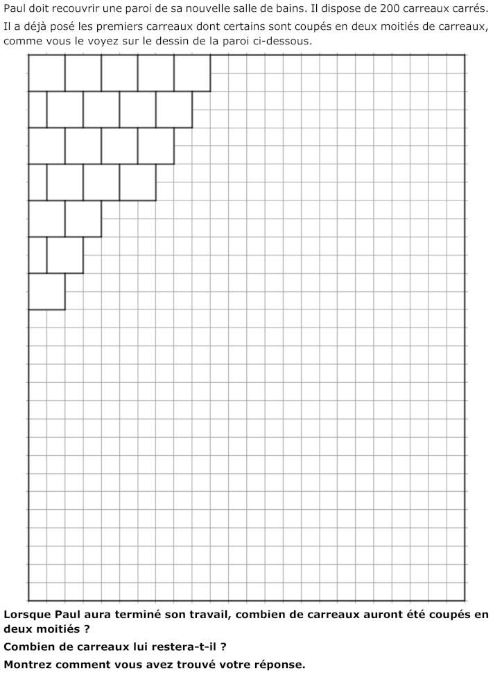 - ne compléter qu’une partie du carrelage (une ligne et une colonne au moins pour s’apercevoir qu’il y a 12 carreaux entiers dans une ligne sur deux et aussi 12 carreaux entiers dont l’un est partagé en deux rectangles placés sur les bords dans les autres lignes, qu’il y a 15 lignes en tout et donc 180 (12 × 15) carreaux au total. Puis calculer la différence à 200 et compter les 14 demi-carreaux qui représentent 7 carreaux entiers.