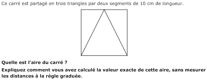 Calculer l’aire d’un carré dans lequel deux segments issus d’un point d’un côté aux deux sommets opposés du carré mesurent chacun 10 cm.