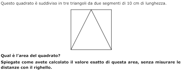 - 8 elaborati con una risposta prossima a 67 cm$^2$". Sia si tratta di un errore nell'equazione x$^2$ + x$^2$/2 = 100 dove (x/2)$^2$ non è x$^2$/4. Sia l'area di uno dei triangoli rettangoli è un terzo di 100.