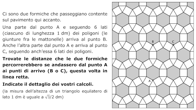 Sapere che un esagono regolare può essere scomposto in sei triangoli equilateri, le sue diagonali sono composte da due lati di questi triangoli e la distanza tra due lati paralleli corrisponde a due altezze di questi triangoli. Poiché l'altezza di un triangolo equilatero con lato di lunghezza 1 è data nell'enunciato del problema, l'altezza di un triangolo equilatero con lato di lunghezza 1 dm è uguale a √3/2 dm, è necessario essere in grado di applicare questa informazione o di ricalcolarla utilizzando il teorema di Pitagora: comprendere le notazioni √3 e √3/2, o fornire un'approssimazione "ragionevole", ecc.