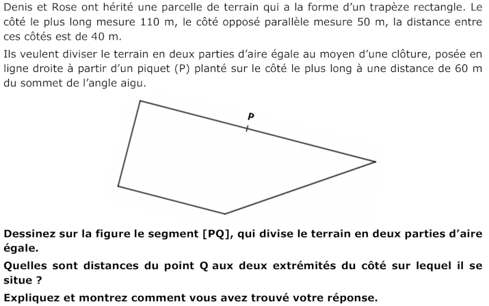 - Réaliser éventuellement que si le point Q était sur le côté de 40 m, ou sur le côté non parallèle aux deux bases, l’une des deux figures obtenues serait un triangle de surface trop petite, n'ayant pas une aire de 1600 m$^2$.