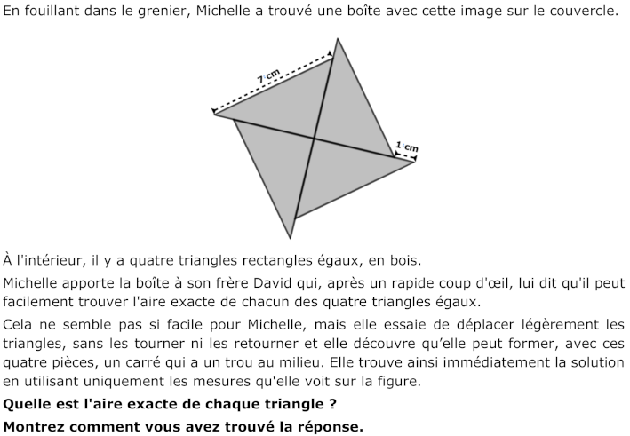 - Comprendre la situation : les quatre triangles sont rectangles et tous identiques, ils ont une hypoténuse de 7 cm de long et un côté de l’angle droit plus long de 1 cm que l'autre côté de l’angle droit, il faut construire un carré avec un "trou" avec tous les triangles, il faut trouver l'aire d'un triangle.