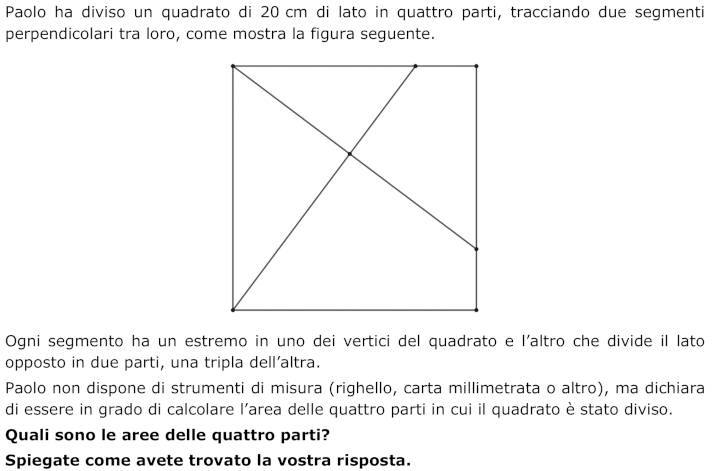 A partire da un quadrato di lato assegnato, calcolare l’area di ciascuna delle parti in cui il quadrato viene diviso da due segmenti perpendicolari tra loro.