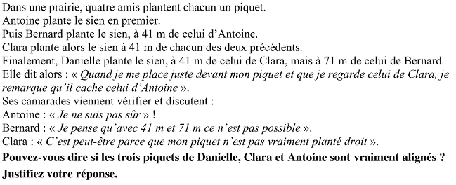 Décider et justifier de l’alignement de trois points dans une situation où sont donnés un triangle équilatéral de côté 41 m et un point situé à 41 m et 71 m de deux de ses sommets, qui apparaît, par construction avec les instruments de dessin géométriques, comme le prolongement d’un de ses côtés.