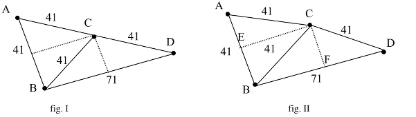 La figure ABD est considérée proche d'un triangle rectangle et les élèves y appliquent le théorème de Pythagore dans le sens "direct": triangle rectangle + connaissance des côtés de l'angle droit (41) et (71) => possibilité de calculer la longueur de l'hypoténuse (√(412 + 712) = √6722) et d'arriver ainsi à une valeur légèrement différente de 82 = 2 x 41; sans penser que, réciproquement, que si le théorème de Pythagore ne "marche pas" dans ce cas, c'est que la figure de départ n'est pas un triangle, mais un quadrilatère. L'obstacle est évident: faut-il faire confiance à sa vision dans le domaine de la géométrie ou aux calculs dans le domaine de l'arithmétique?