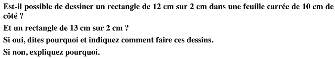 Vérifier si un rectangle de 12 cm sur 2 cm, puis un rectangle de 13 cm sur 2 cm, peuvent être inscrits dans un carré de 10 cm de côté.