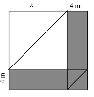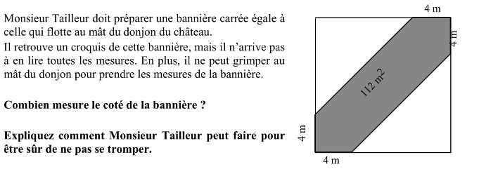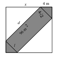 L'aire du rectangle est ainsi de 112 – 16 = 96 m2, sa largeur est la diagonale d’un carré de 4m de côté : 4√2 et par conséquent, sa longueur est (en mètres) (96/4) √2 = 24/√2 puis trouver x d’après la relation x = d /√2 (en mètres) x = (24√2)/ √2 = 24 /2 = 12 et finalement en déduire la mesure du côté : 12 + 4 = 16 (mètres)