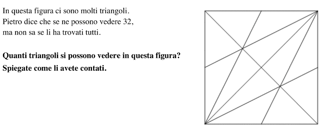 Determinare il numero di triangoli (40) che si possono osservare in una figura composta da un quadrato, delle sue due diagonali e da quattro segmenti che collegano due vertici alle metà dei lati opposti.