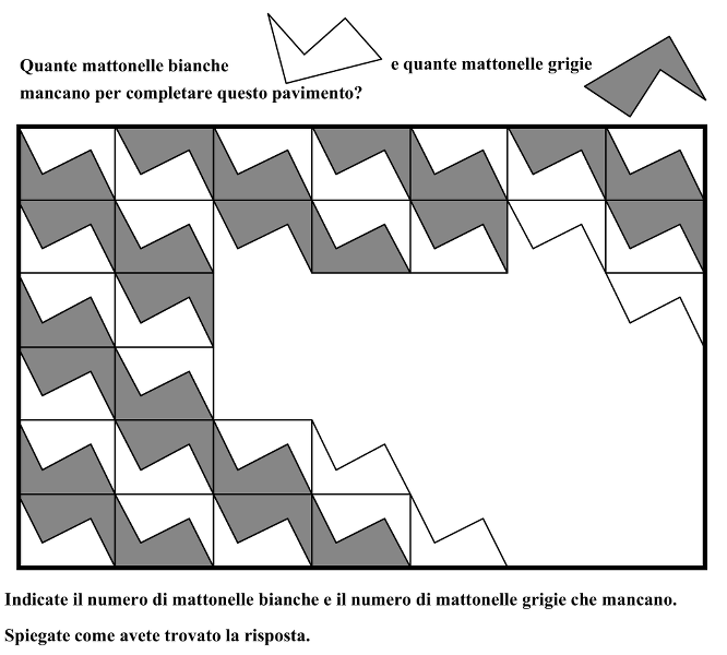 Completare la pavimentazione di un rettangolo con delle mattonelle uguali, convesse, di 5 lati, di due colori che, in coppia, formano rettangoli. Questi rettangoli formano una griglia 6 × 7. Indicare quindi il numero di mattonelle mancanti per ciascun colore.
