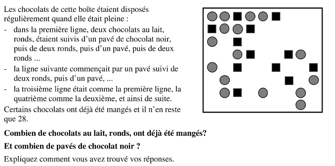 Ou: compter le nombre de lignes (8) et remarquer que dans chacune d’entre elles il y a 6 ronds et 3 carrés .Calculer alors les nombres initiaux de chocolats de chaque type: 6 x 8 = 48 ronds et 3 x 8 = 24 carrés. Finalement compter les chocolats restants de chaque type et les soustraire aux nombres initiaux, pour les ronds : 48 – 16 = 32, pour les carrés; 24 – 12 = 12.