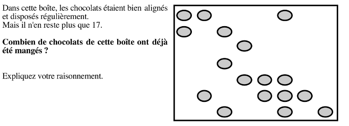 Dénombrer les objets manquants dans un alignement sur 7 lignes et 8 colonnes, avec 17 objets dessinés, dans un contexte de boîte de chocolats.