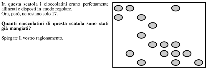 Contare gli oggetti mancanti in un allineamento su 7 linee e 8 colonne, con 17 oggetti disegnati, in un contesto di scatola di cioccolatini.