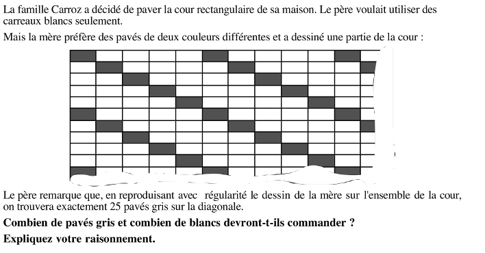 Paver un rectangle par des pavés blancs et gris, selon un motif donné, mais incomplet. Recherche du nombre de pavés de chaque sorte.