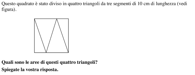 Un quadrato è diviso in quattro parti da tre segmenti lunghi 10 cm: due triangoli isosceli congruenti e due triangoli rettangoli, congruenti fra loro, che corrispondono alla metà dei triangoli isosceli. Calcolare l'area dei 4 triangoli.