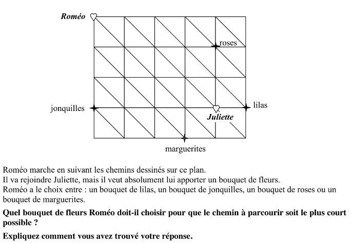 - Remarquer que parmi les trois chemins de 6 tronçons, la longueur des chemins des marguerites et des lilas sont les mêmes alors que celui des roses n’emprunte qu’une diagonale au lieu de trois pour les deux autres. En déduire que le chemin des roses est le plus court de ces trois chemins.