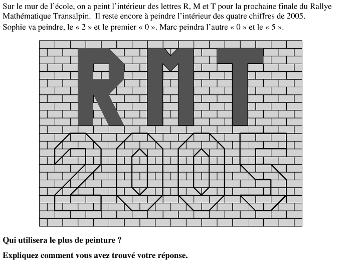 Il ne reste plus alors qu’à conclure : expliquer que c’est Marc qui utilisera le plus de peinture, en disant par exemple que le « 2 » contient l’équivalent de 17 briques rectangulaires alors que le « 5 » contient l’équivalent de 18 de ces briques.