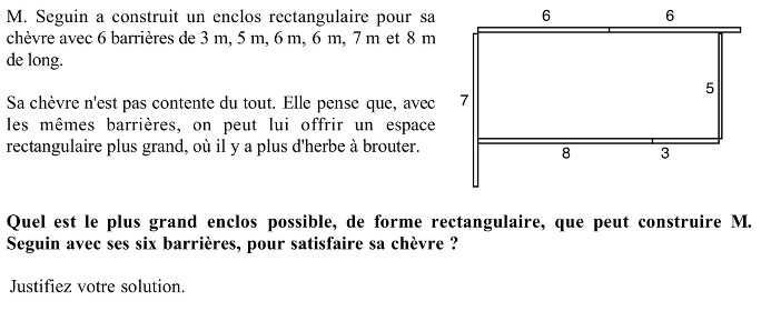 D'autre part, on peut imaginer que les élèves ont lu plus attentivement la première partie de l'énoncé que la demande finale, même si celle-ci était en caractère gras : "Quel est le plus grand enclos possible, de forme rectangulaire, que peut construire M. Seguin avec ses six barrières, pour satisfaire sa chèvre ?"