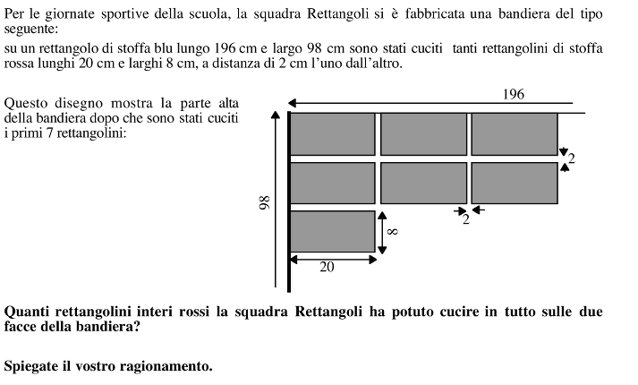 O effettuando le divisioni 196:22=8 resto 20 e 98:10=9 resto 8, tenendo presente anche la larghezza della stoffa blu che separa due rettangoli e interpretando correttamente i resti ottenuti (i resti comportano la presenza di un ulteriore rettangolino rosso sia in lunghezza che in larghezza)