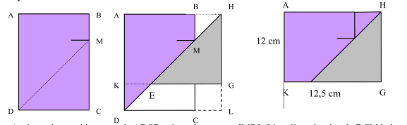 Ou : après avoir trouvé que le nouveau rectangle a comme dimensions 12 cm x 12,5 cm, le dessiner et y placer le triangle MCD (obtenu par le premier coup de ciseaux) et chercher comment couper le trapèze rectangle pour recouvrir la surface avec trois pièces.