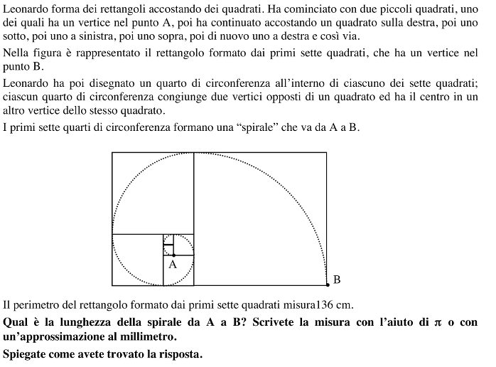 - Calcolare le lunghezze dei quarti di circonferenza e sommarle: π/2 + π/2 + 2π/2 + 3π/2 + 5π/2 + 8π/2 + 13π/2 = 33π/2 = 16,5 π (in lato del quadrato-unità) o 33π (in cm) o un’approssimazione come 103,7 in cm o 1037 mm (si accetterà anche 103,6 cm o 1036 mm per gli allievi che utilizzano 3,14 come approssimazione).