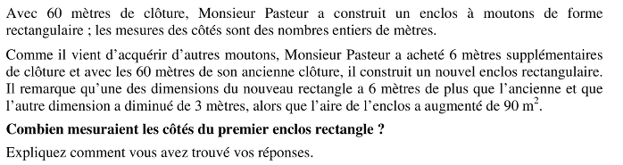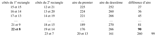 Ou, en désignant par x et y les dimensions du rectangle initial, on pose x + y = 30 et (x + 6)(y - 3) = 90 + xy