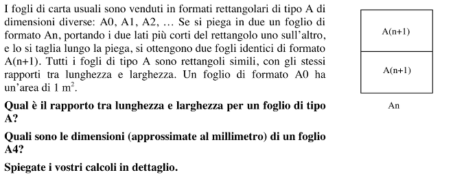 Determinare il rapporto tra lunghezza e larghezza di un foglio di formato A e trovare le dimensioni al millimetro di un foglio A4.