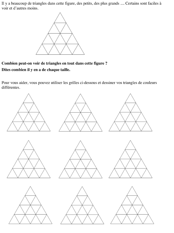 - Organiser les comptages de manière à ne pas oublier de triangles, en particulier en distinguant ceux qui "sont sur leur base" de ceux qui « ont la tête en bas »