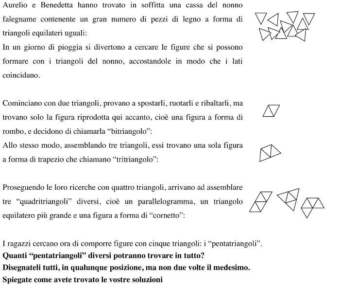 Determinare il numero di pentatriangoli (figure ottenute assemblando cinque triangoli equilateri con i lati coincidenti) possibili.