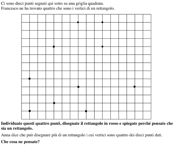A partire da dieci punti su una griglia quadrettata, ricerca di gruppi di quattro punti che formano dei quadrilateri aventi le proprietà caratteristiche del rettangolo.
