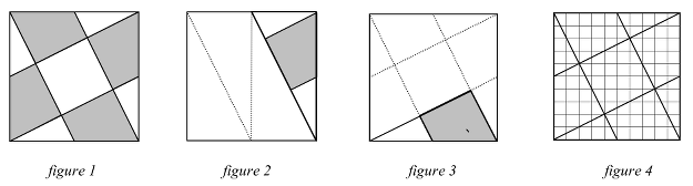 Reconnaître que les neuf parties sont un carré central, quatre trapèzes rectangles égaux et quatre triangles rectangles égaux. On peut distinguer aussi quatre « grands » triangles ( composés d’un trapèze et de deux « petits » triangles, figure 2), quatre triangles « moyens » (composés d’un trapèze et d’un « petit » triangle, figure 3) puis observer par exemple que les« grands » triangles sont des quarts du grand carré, (mesure des côtés de l’angle droit 5 et 10 cm, aire 25 cm2, hypoténuse √125 ou 5√5 cm) ou que tous les triangles de la figure sont semblables (mêmes angles, et rapport 2 entre les mesures des côtés de l’angle droit) …