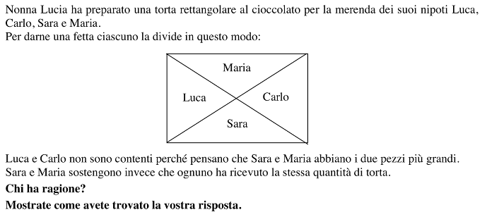 Esempio:… Quelle di Maria e Sara sono più larghe e quelle di Luca e Carlo sono più lunghe dunque hanno la stessa parte. Sono Sara e Maria ad aver ragione.