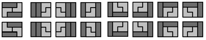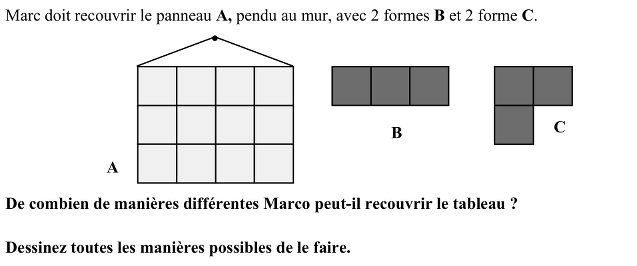 Recouvrir un rectangle de 4 x 3 avec deux rectangles de 1 x 3 et deux formes en "L" composées de trois carrés 1 x 1. Trouver tous les recouvrements.