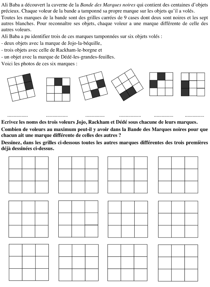 - Découvrir qu’un des groupes de trois figures se décompose en deux marques égales (la première et la dernière, qu’on peut superposer par une rotation d’un demi-tour) et que la quatrième depuis la gauche est « retournée » par rapport aux deux autres, donc qu’elle est d’un voleur différent.