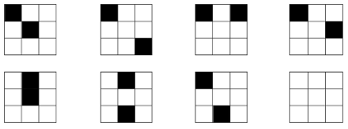 - Dessiner ensuite les autres dispositions différentes des deux carrés noirs sur les marques et constater qu’il y en a 10 en tout (7 nouvelles et les trois déjà présentées):