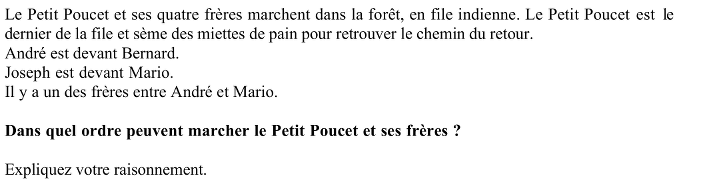 A partir d’indications sur l’ordre dans lequel se trouvent 4 éléments, reconstituer l’ordre total dans lequel ils sont placés.