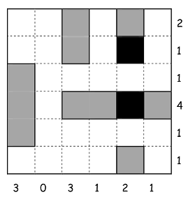 Dans une grille carrée de 6 x 6, placer six rectangles de différentes dimensions (un de 3 x 1, deux de 2 x 1 et trois de 1 x 1), en respectant des conditions sur leurs positions et sur le nombre des cases occupées dans chaque ligne et chaque colonne.