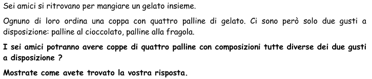 - Dedurre che ci sono solo cinque coppe di gelato possibili: F-F-F-F C-C-C-C C-F-F-F F-C-C-C F-F-C-C e che i sei amici non potranno avere tutti una coppa diversa.