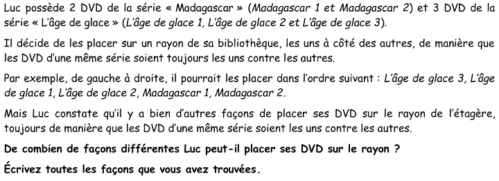 Finalement, observer qu’on peut intervertir les deux séries en plaçant d’abord les trois DVD de la série L puis les deux de la série M, ce qui double le nombre des dispositions 12 × 2 = 24