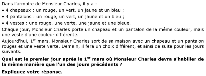 - Conclure que le 13 mars est la première journée où Monsieur Charles sera obligé de s'habiller de la même manière qu'un des jours précédents.