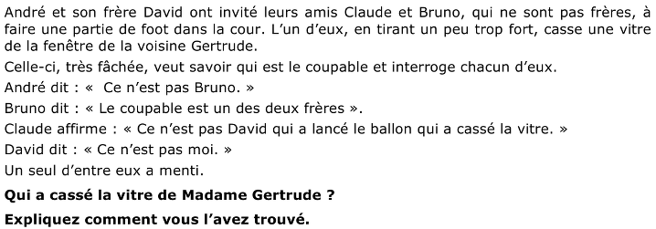 - Conclure que c’est Bruno qui ment et que, par conséquent, la vitre a été cassée par Claude ou Bruno lui-même. De l’affirmation d’André, vraie, il s’ensuit que c’est Claude le coupable. (L’obstacle à surmonter est d’accepter l’idée que celui qui ment n’est pas forcément le coupable.)