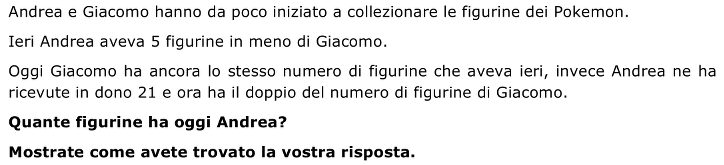 - Oppure, (procedura esperta, ritenuta però poco probabile ai livelli considerati), comprendere che delle 21 figurine che oggi Andrea ha ricevuto in dono, 5 servono per avere lo stesso numero di figurine di Giacomo e le altre 16 per raddoppiare questo numero.