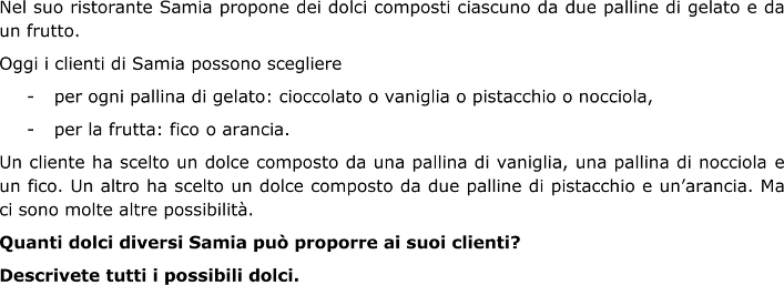 - Comprendere la composizione di un dolce e le scelte riguardanti ciascuna delle due palline di gelato per le quali ci sono quattro possibilità e la frutta per la quale ce ne sono solo due.
