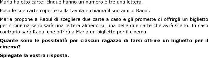 - Concludere che Raoul ha più possibilità di farsi offrire il biglietto per il cinema, perché 18 sorteggi su 28 (o 36 su 56) sono di più delle possibilità di Maria, 10 sorteggi su 28 (o di 20 su 56).