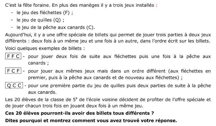 Si l’on désire exploiter ce problème à des fins didactiques, il semble que la meilleure manière de la faire est de faire comparer les différents billets trouvés afin de déterminer, entre élèves, une structure permettant de les organiser, par exemple celle de 3 « paquets » de 6 billets. (Il y a 6 billets commençant pas A ou par B ou par F ; il y a six billets où ne figurent que les deux lettres A et B ou A et F ou B et F … . Il faut cependant éviter toute « formule » ou règle.