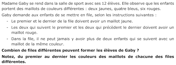 Il s'agit de combinatoire, qui exige une organisation systématique des files possibles pour trouver le nombre de « permutations » respectant les trois conditions de l'énoncé.